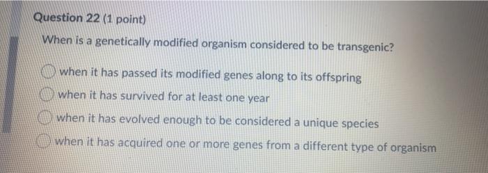 The genetic modification is accomplished by inserting DNA into an embryo with the assistance of a virus a plasmid or a gene gun. A mutated organism c. Which of the following best describes a transgenic organism.